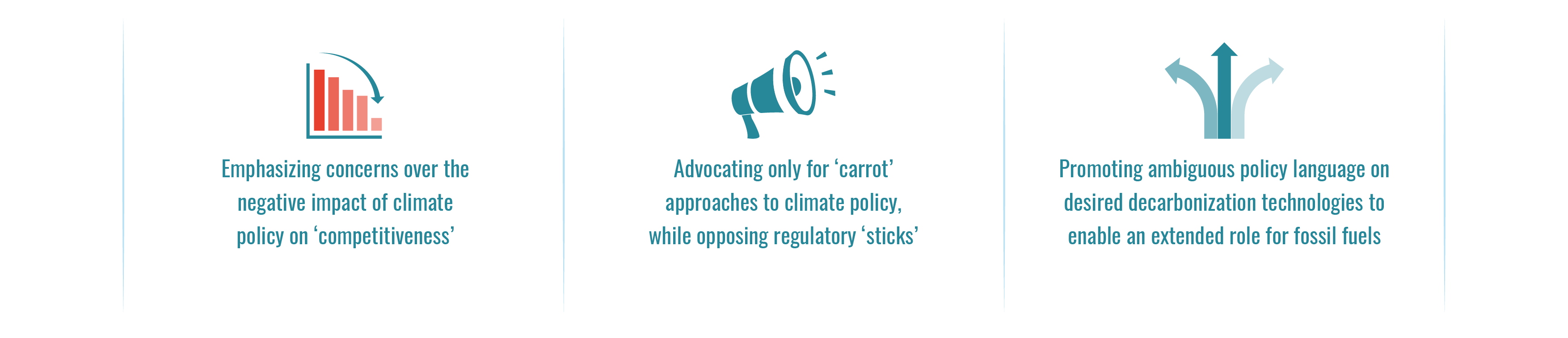 The briefing highlights the impact of climate advocacy by industry associations representing sectors such as chemicals, construction, and automotives at the EU level, as well as cross-sector industry associations advocating for business interests in specific EU member states (e.g., Italy, Germany, and France). Over the past few years, these groups have resisted aspects of European climate policy ambition by deploying tactics like emphasizing the potential negative impact of climate policies on European “competitiveness,” advocating for incentive-based (“carrot”) approaches while opposing binding regulations, and promoting ambiguous policy terminology to leave the door open to continued reliance on fossil fuel technologies.