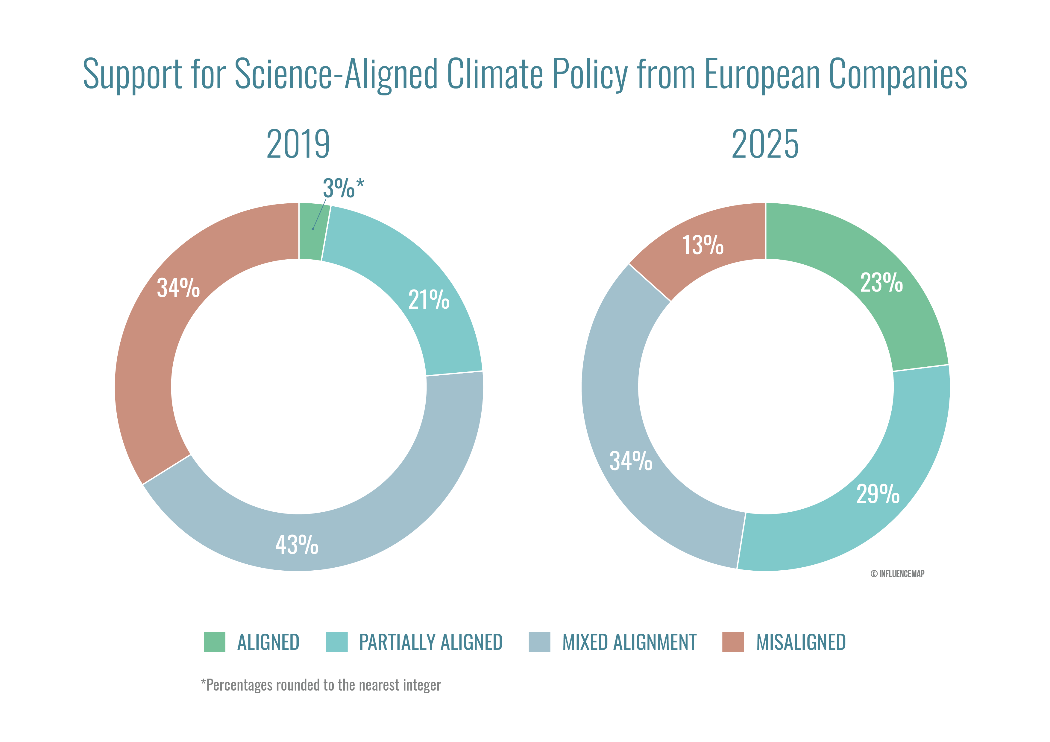 European headquartered companies have become significantly more supportive of science-aligned climate policy since the start of the 2019 European legislative cycle. Analysis from the LobbyMap platform’s assessment of nearly 200 European headquartered companies shows that the proportion of companies assessed to have fully aligned their climate policy advocacy with science-aligned policy has risen from 3% in 2019 to 23% in 2025. Conversely, the share of misaligned companies has dropped from 34% to 13%. This shift tracks the evolution of the European Green Deal, which was proposed and implemented between 2019–2024. The evolution in corporate attitudes in broad support for policies such as the Climate Law, the reforms of the Energy Performance of Buildings Directive, the Renewable Energy Directive, and the Energy Efficiency Directive appears to contradict the prevailing narrative that European business supports deregulation on climate.